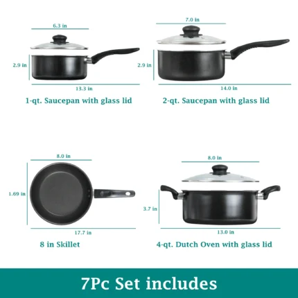 - Includes 1 Qt saucepan (with lid), 2 Qt saucepan (with lid), 4 Qt Dutch oven (with lid), and 8-inch frying pan. Covers daily cooking tasks: boiling, simmering, stewing,