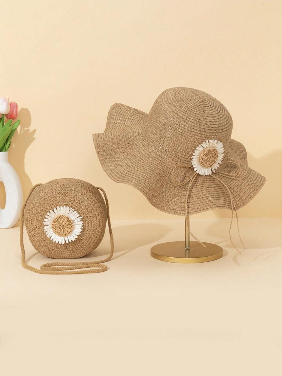 2pcs Women Khaki Wavy Sunflower Beach Hat & Bag (Multi-Color)