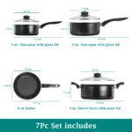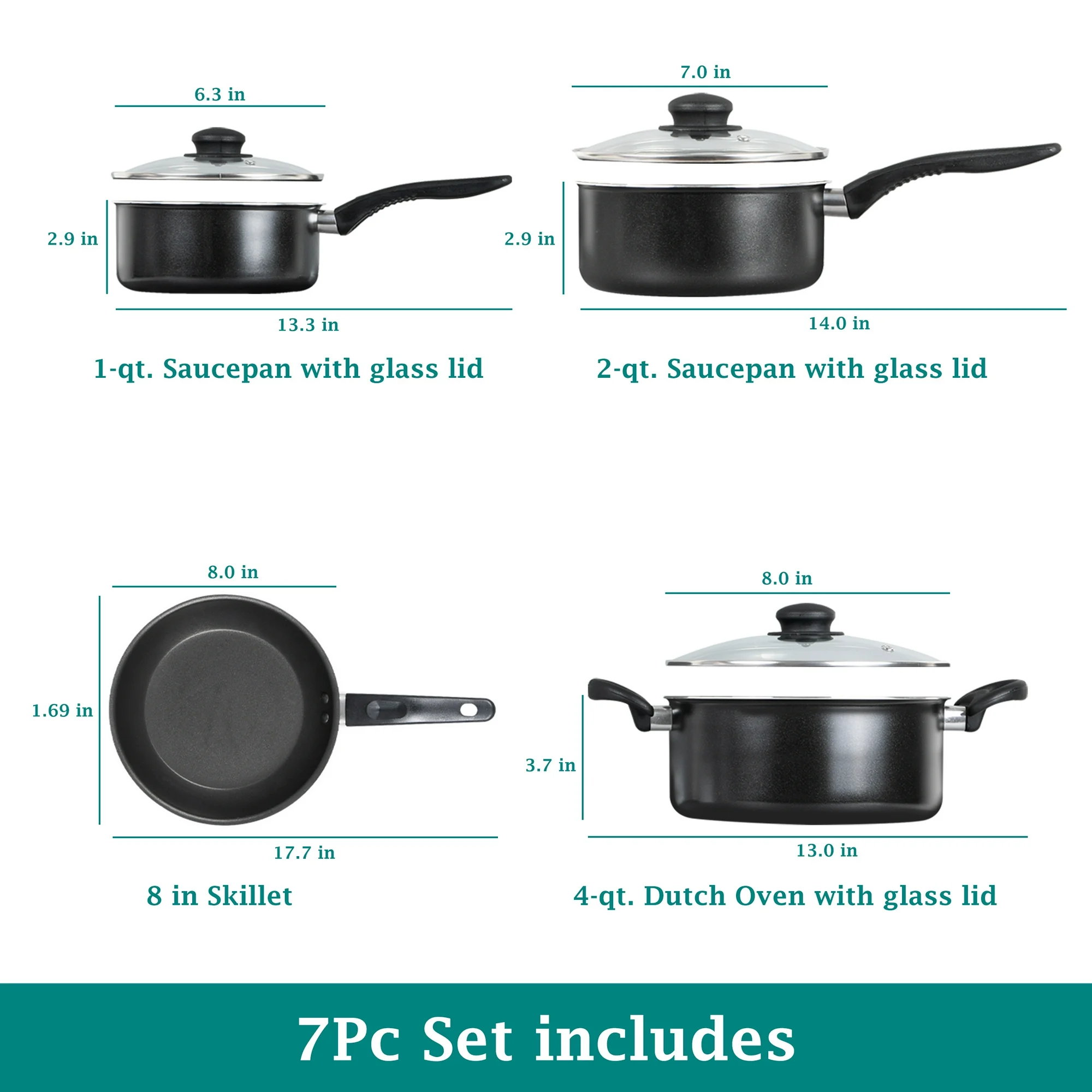 • Includes 1 Qt saucepan (with lid), 2 Qt saucepan (with lid), 4 Qt Dutch oven (with lid), and 8-inch frying pan. Covers daily cooking tasks: boiling, simmering, stewing,